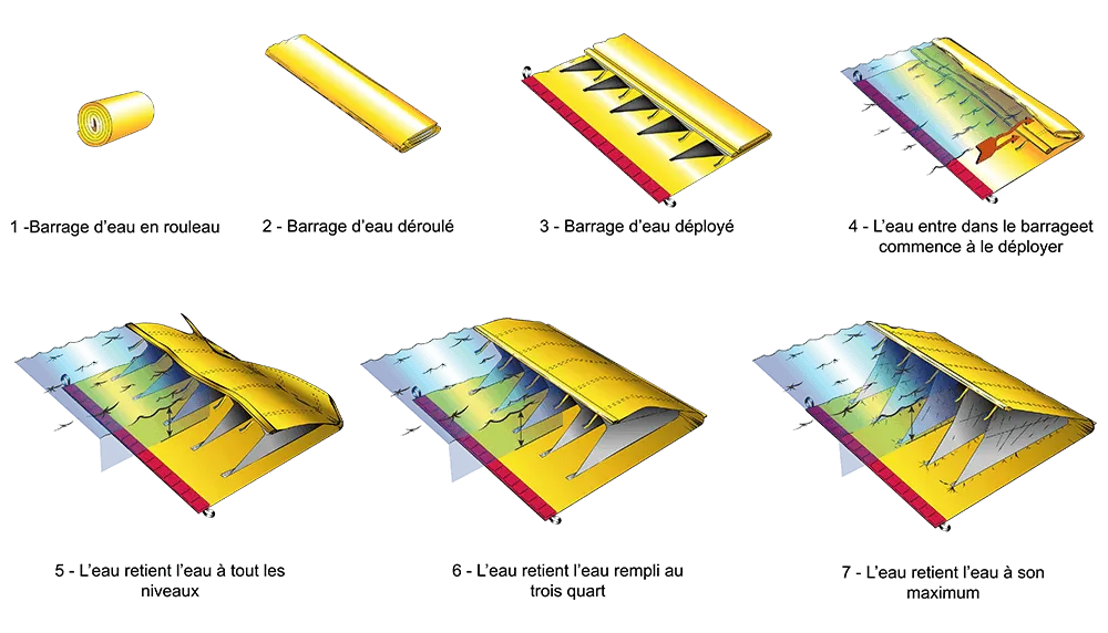 De innovatieve technologie van Water-Gate waterkeringen maakt gebruik van de natuurlijke dynamiek van water om hun stabilisatie op de grond te waarborgen, zonder dat verankering nodig is.